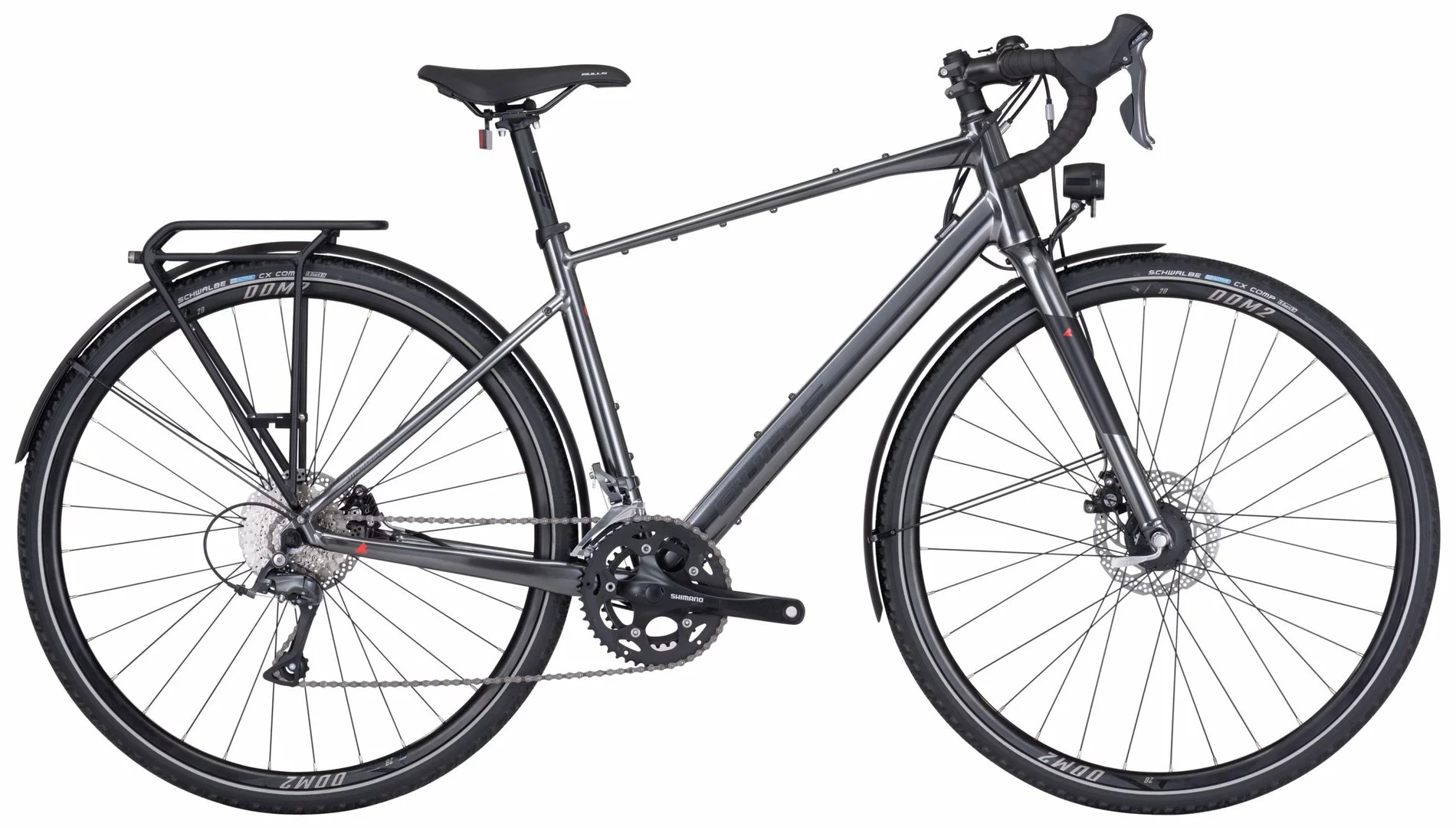 6061 Alu Rahmen mit tapered Steuerrohr und innenverlegten Kabeln, Aluminium Aero-Gabel, Shimano Claris 16-Gang Compact Schaltung, RS305 mech. Scheibenbremsen, RS-200 Kurbeln 34-46 mit UN300-Innenlager, DDM-2 Felgen, Schwalbe CX-Comp Reifen 40-622, DH-3D37 Nabendynamo, 50 Lux LED-Lampe, LED Rücklicht, Urban Gepäckträger, Metall-Schutzbleche, Oversized Lenker, Soft Lenkerband