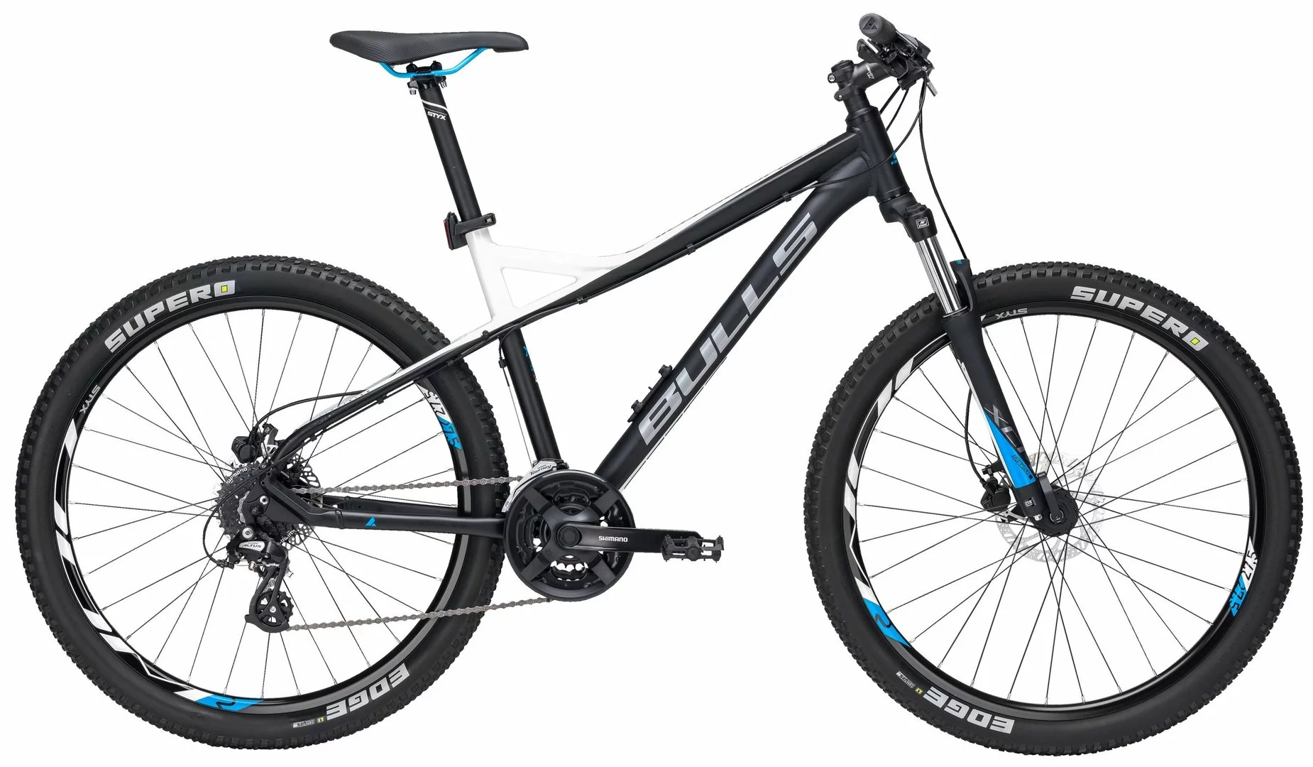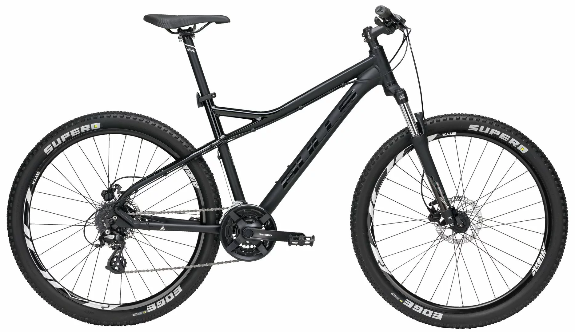7005 Alu Rahmen, Suntour XCM Federgabel einstellbar, 24-Gang Altus Schaltwerk und Schalthebel, Tourney Umwerfer und Tretlager, Formula Naben, Tektro HD-M275 hydr. Disc-Bremsen, STYX DDM-2 Disc Felgen, STYX Lenker, Vorbau und Sattelstütze, Supero Edge Reifen (27½x2,25 Zoll), Monkey-Link Halter vormontiert