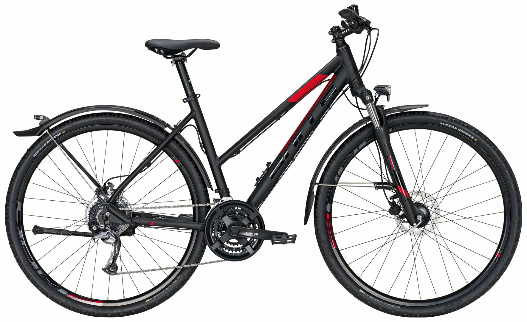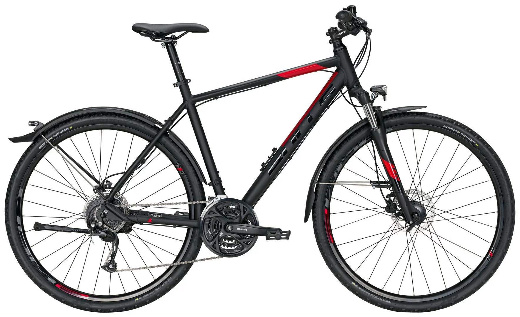 Mit dem STREET FLYER kommt man nicht nur schnell von A nach B. Dank Cross-Bereifung und der sportlichen Ausstattung ist der vielseitige Allrounder auch für schnelle Trainingsrunden und Touren durch die Natur bestens gerüstet. Dafür sorgen die wertige Shimano 27-Gang-Schaltung und hydraulische Scheibenbremsen. Für den Einsatz im Alltag verfügt das Cross- und Trekkingbike über eine Straßenausstattung mit Fuxon Lichtanlage, Nabendynamo und Schutzblechen.