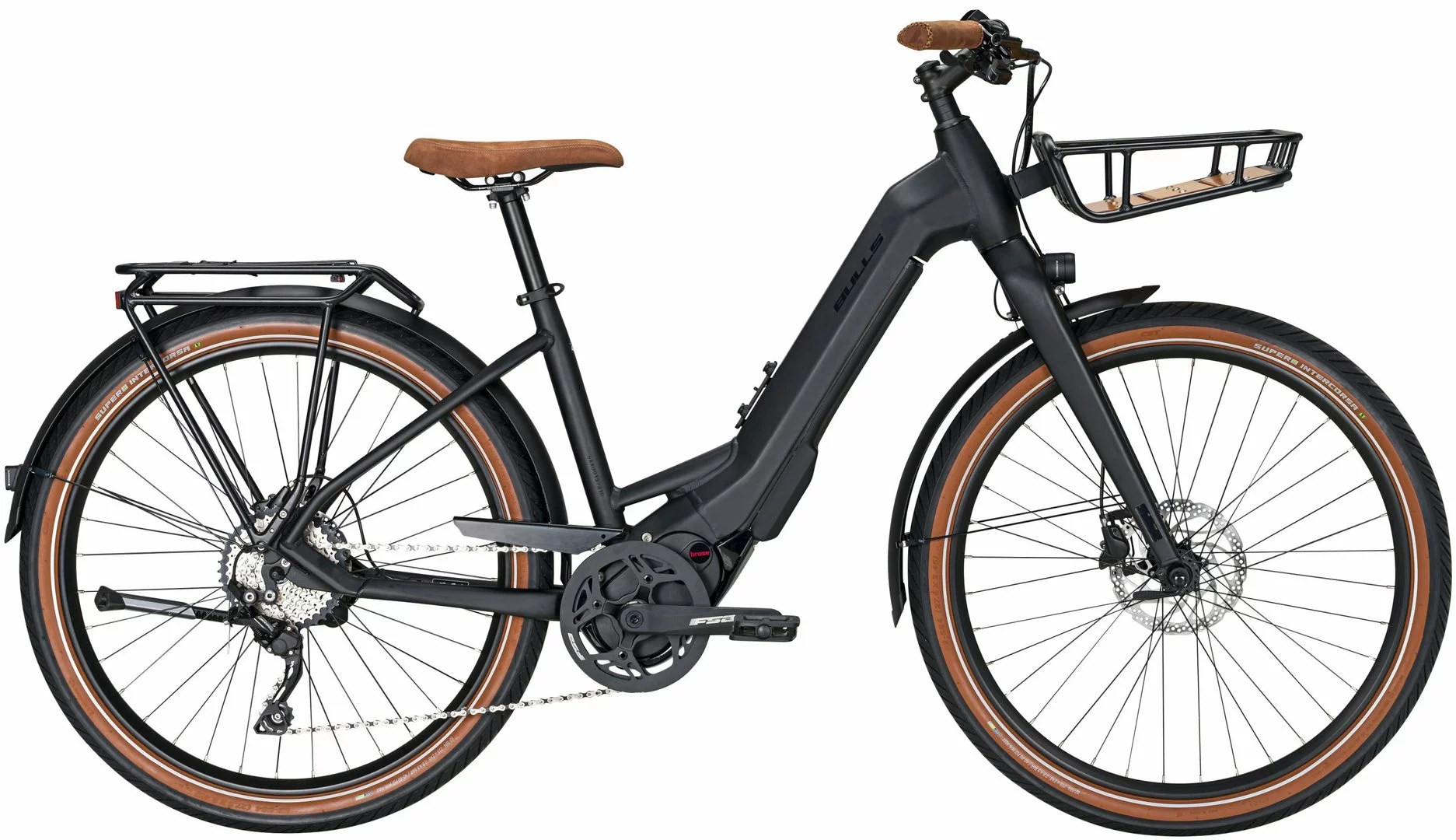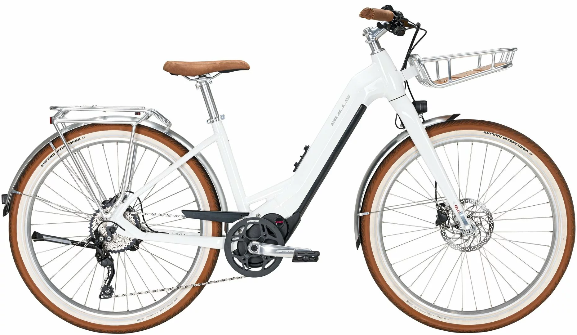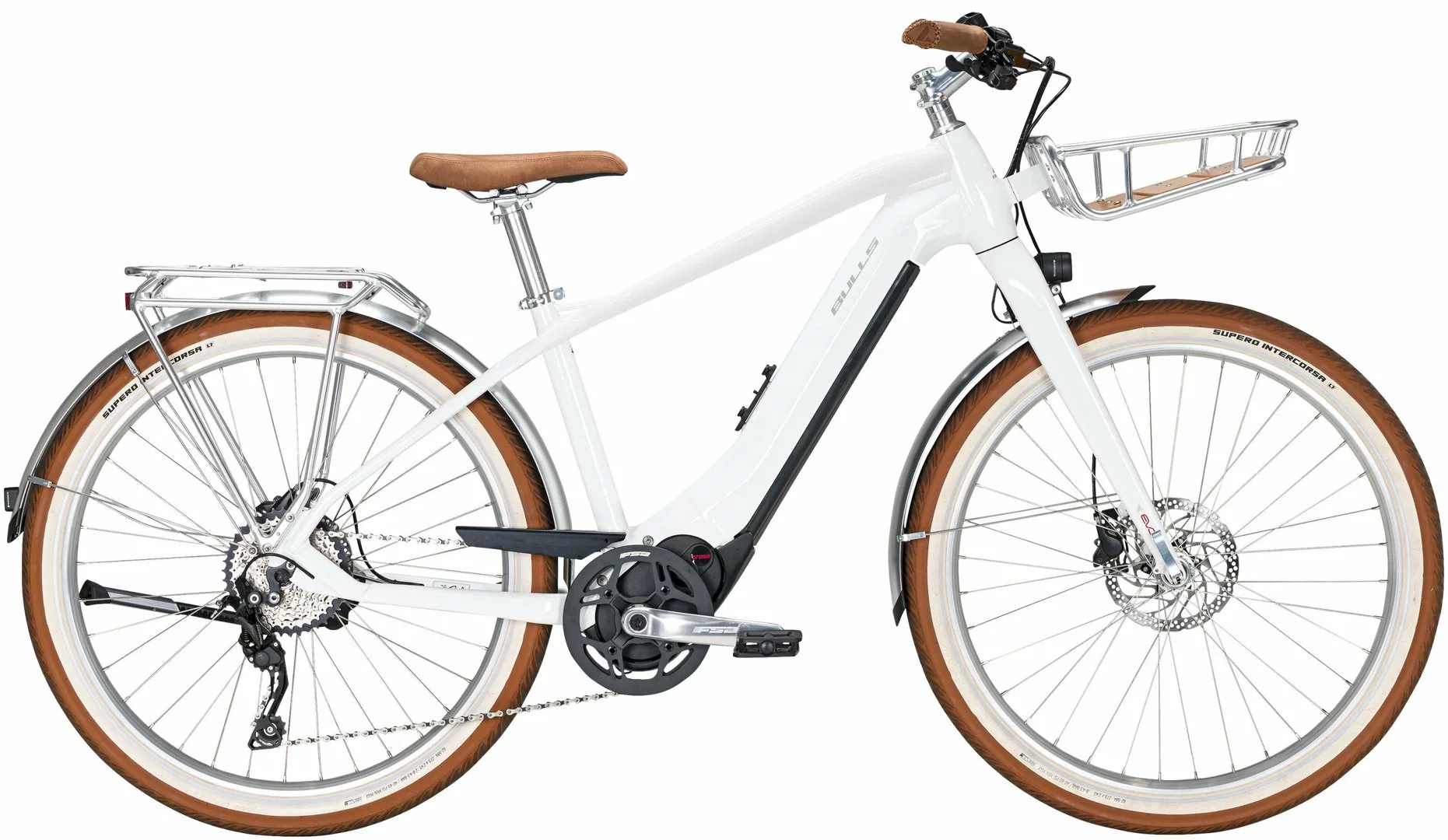 Hydroforming Alu-Rahmen mit Tapered Steurrohr, Aluminium Starrgabel, Deore Schaltwerk, Schalthebel, Naben und Zahnkranz (11-42 Zähne), Shimano MT200 Disc-Bremsen (160/180mm), AS-30P Disc Felgen, Brose Drive-S Mag Mittelmotor 250W / bis 90Nm, 555Wh oder 750Wh Akku (Aufpreis), Beleuchtung über den Akku, Supernova Lampe und Rücklicht, 14D Sport-Display, Supero Intercorsa Reifen 62-584, Leder-Look Griffe und Sattel, I-Rack-2 Gepäckträger, Frontkorb