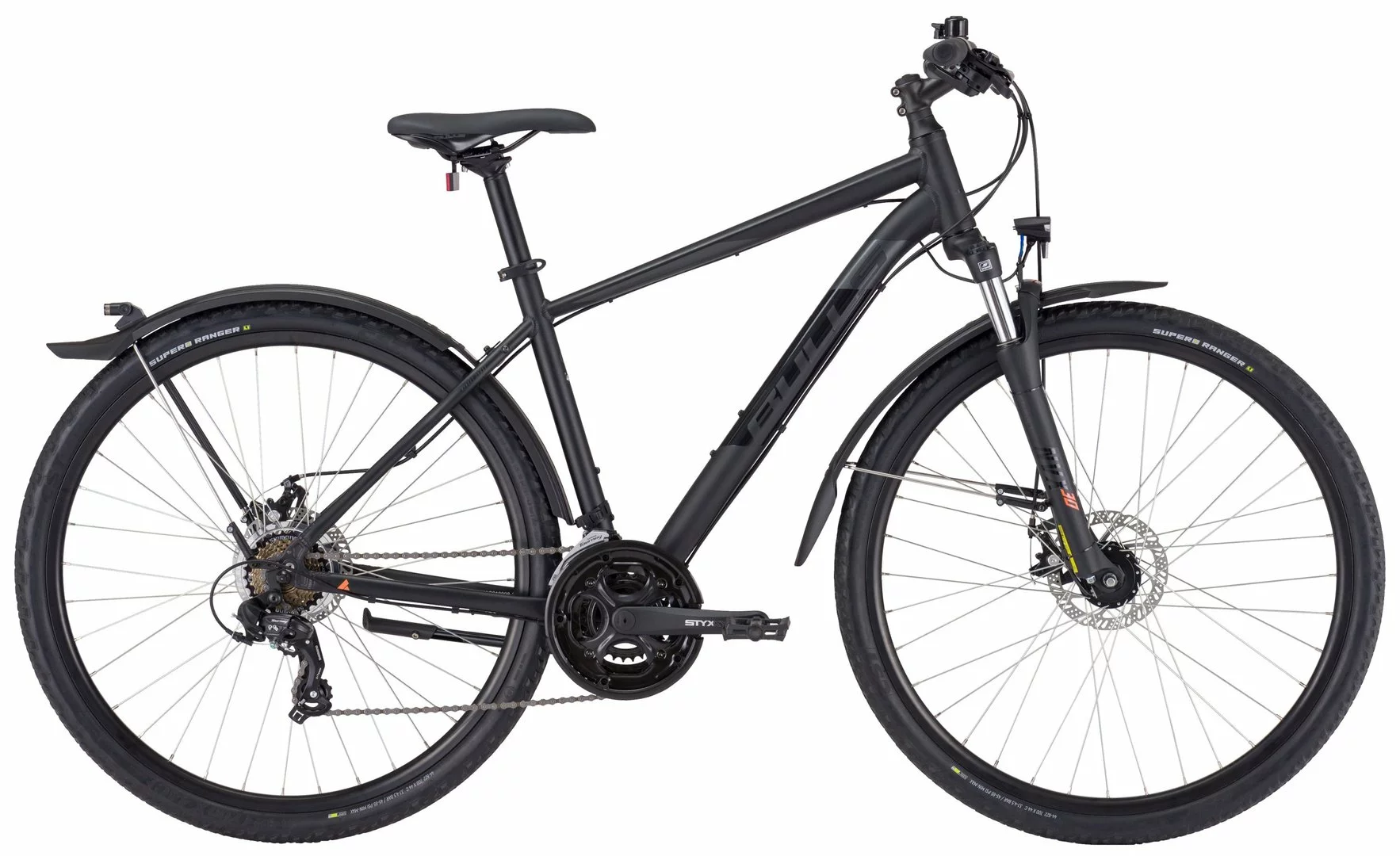 7005-Alu-Biaxial-Rahmen, Suntour NVX-30-DS Federgabel einstellbar, 21-Gang Shimano Tourney Schaltwerk und Umwerfer, Altus EZ-Fire Schalthebel, STYX Kurbeln, Tektro MD-M280 Disc-Bremsen (160/160mm), Formula HR-Nabe, Alu-Hohlkammerfelgen, Nabendynamo, 30 Lux LED-Lampe, Standrücklicht auf dem Schutzblech, Ständer, SKS Velo 55 Steckbleche mit Streben