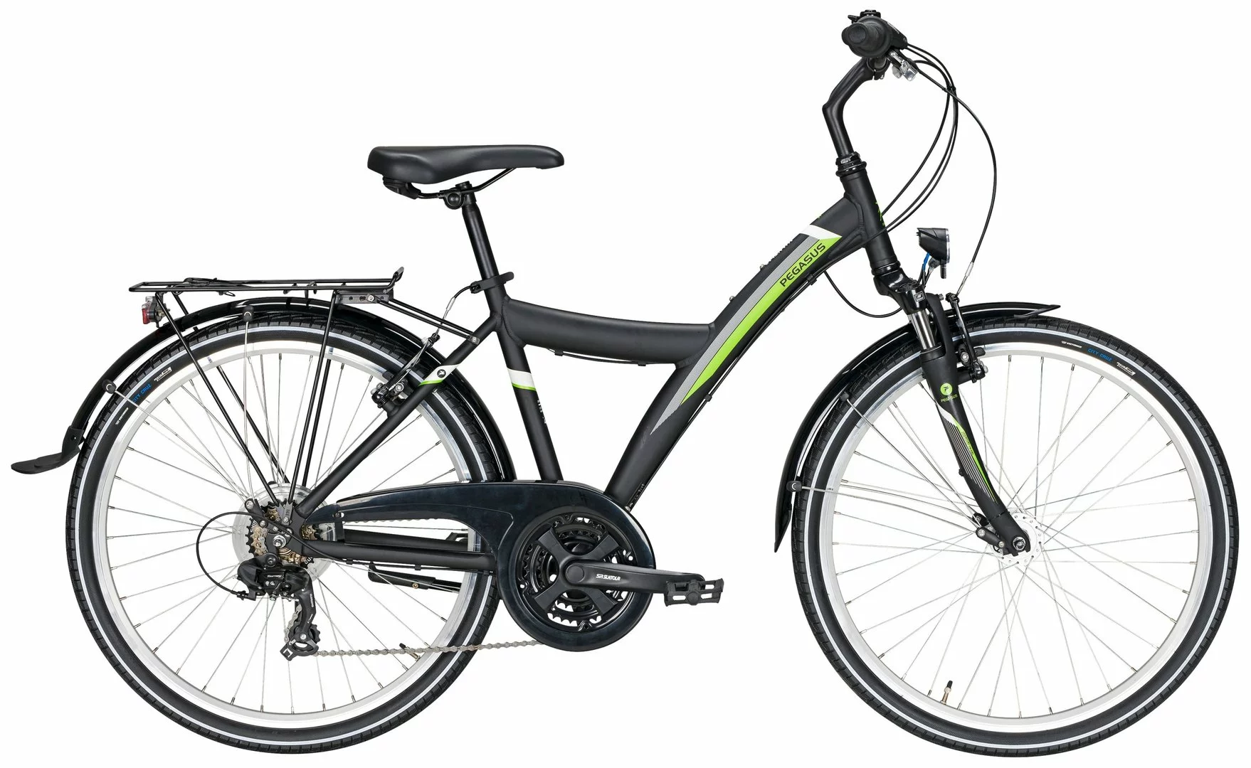Big-Size Alurahmen mit Federgabel, Shimano Tourney Kettenschaltung mit Revoshift Schalthebeln (Drehgriffe), Suntour Alu Kurbeln, Alu V-Bremsen vorne und hinten, Alu-Hohlkammerfelgen, MTB-Lenker, Bar-Ends, Kettenschutz, Straßenausstattung mit Shimano Nabendynamo, Standrücklicht und 30-Lux LED-Lampe