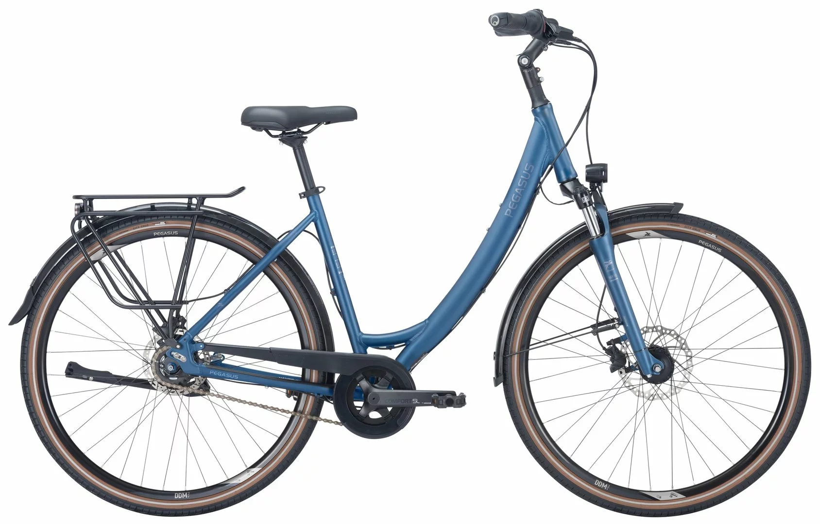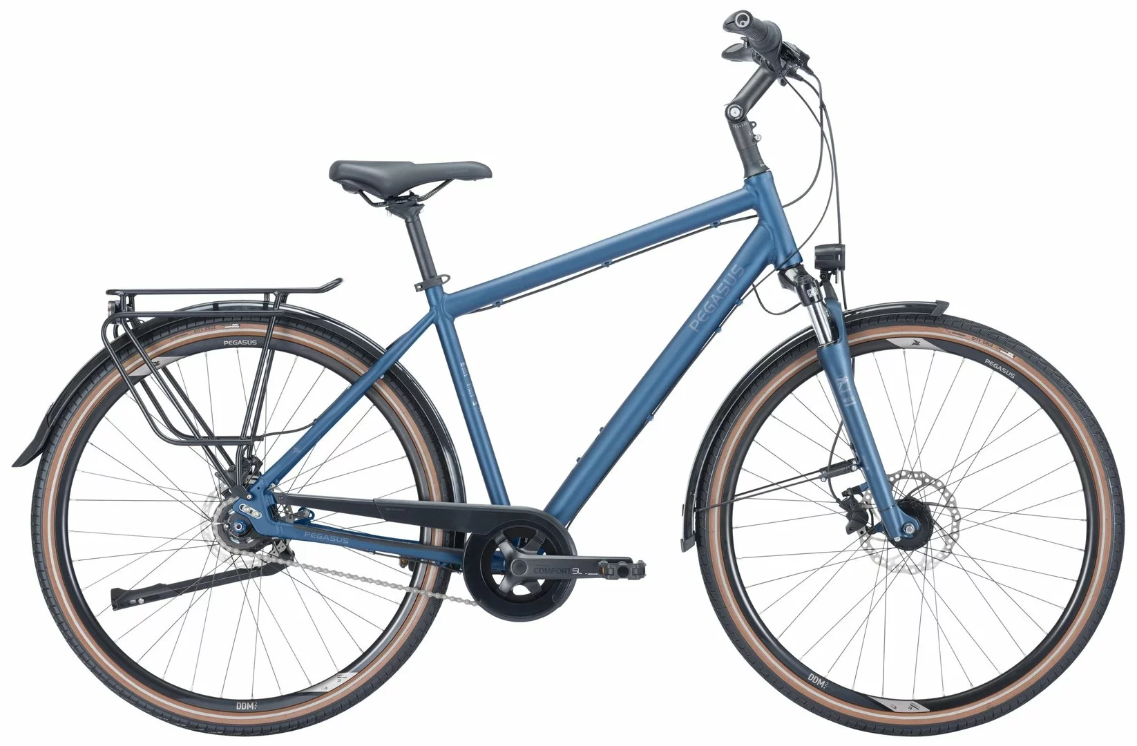 6061 Alu-Rahmen, Suntour NEX-DS einstellbare Federgabel, Nexus 8-Gang Nabenschaltung mit Rücktritt und Revoshift Schalthebel, Tektro HD-T390 Scheibenbremsen mit 2,3mm Scheiben (160/180mm), DDM-2 Hohlkammer-Felgen, VeeTire City Cruz Reifen 44-622, verstellbarer Vorbau mit 31,8mm Lenker, Ergon-Griffe, Nabendynamo, 50 Lux LED-Lampe, Standrücklicht, einstellbarer Hinterbauständer, Horn Catena Kettenschutz, Gummikralle Pedale