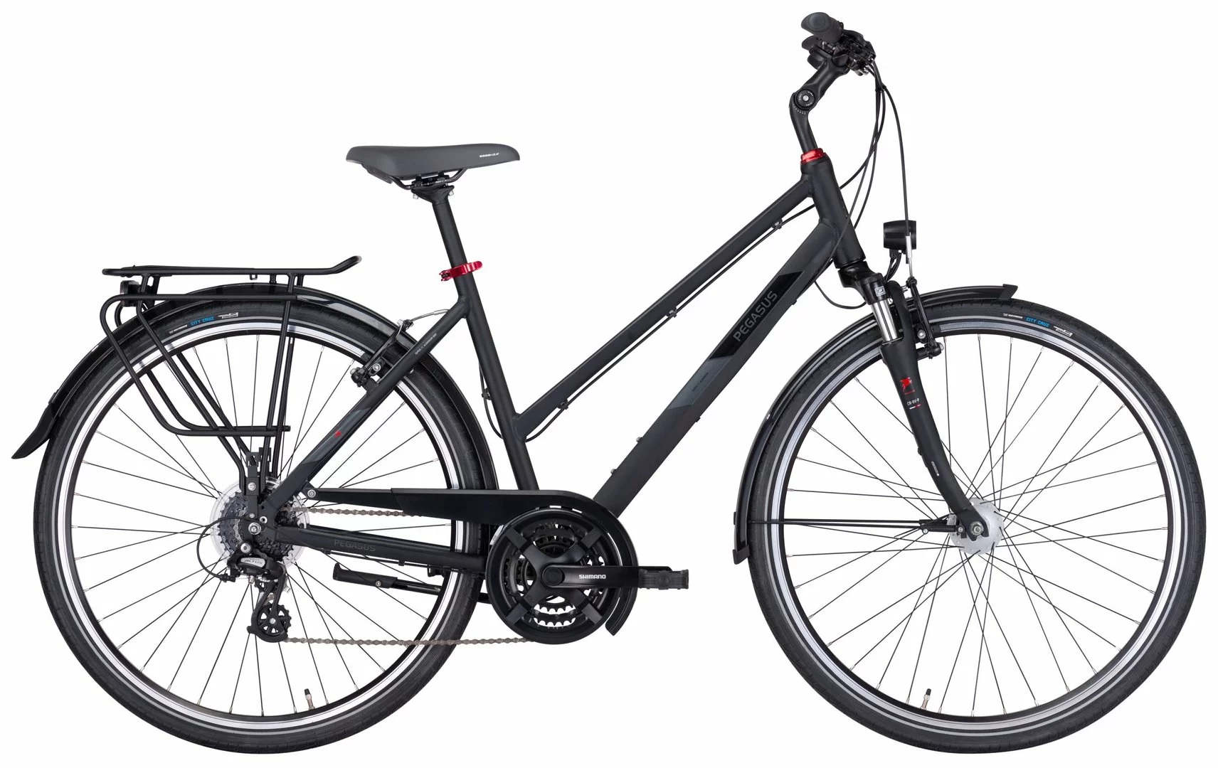 6061 Alu-Rahmen, Suntour CR-8V-P Federgabel, Altus Schaltwerk und Schalthebel, Tourney Umwerfer und Kurbeln (48 Zähne), Formula Kassettennabe, V-Bremsen, DBM-2 Hohlkammer-Felgen, Vee Tire Santa Cruz Reifen (44-622), verstellbarer Vorbau, 2-Bolt Sattelstütze, Nabendynamo, 50 Lux LED Lampe, Standrücklicht, ergonomische Lenkergriffe