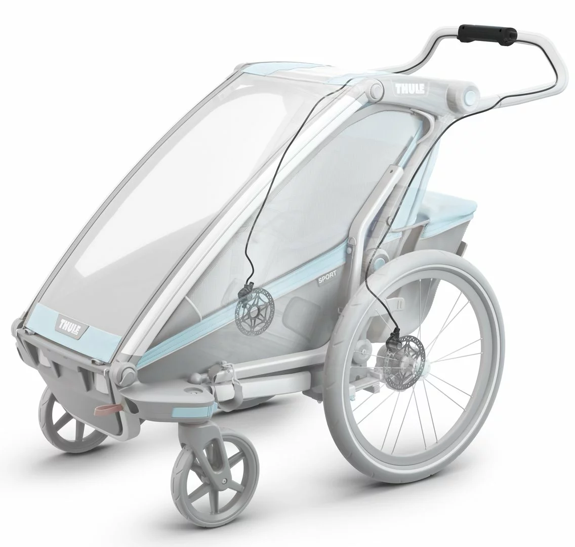 - Handbetätigte Scheibenbremse – für eine verbesserte Kontrolle bei starkem Gefälle und beim Laufen